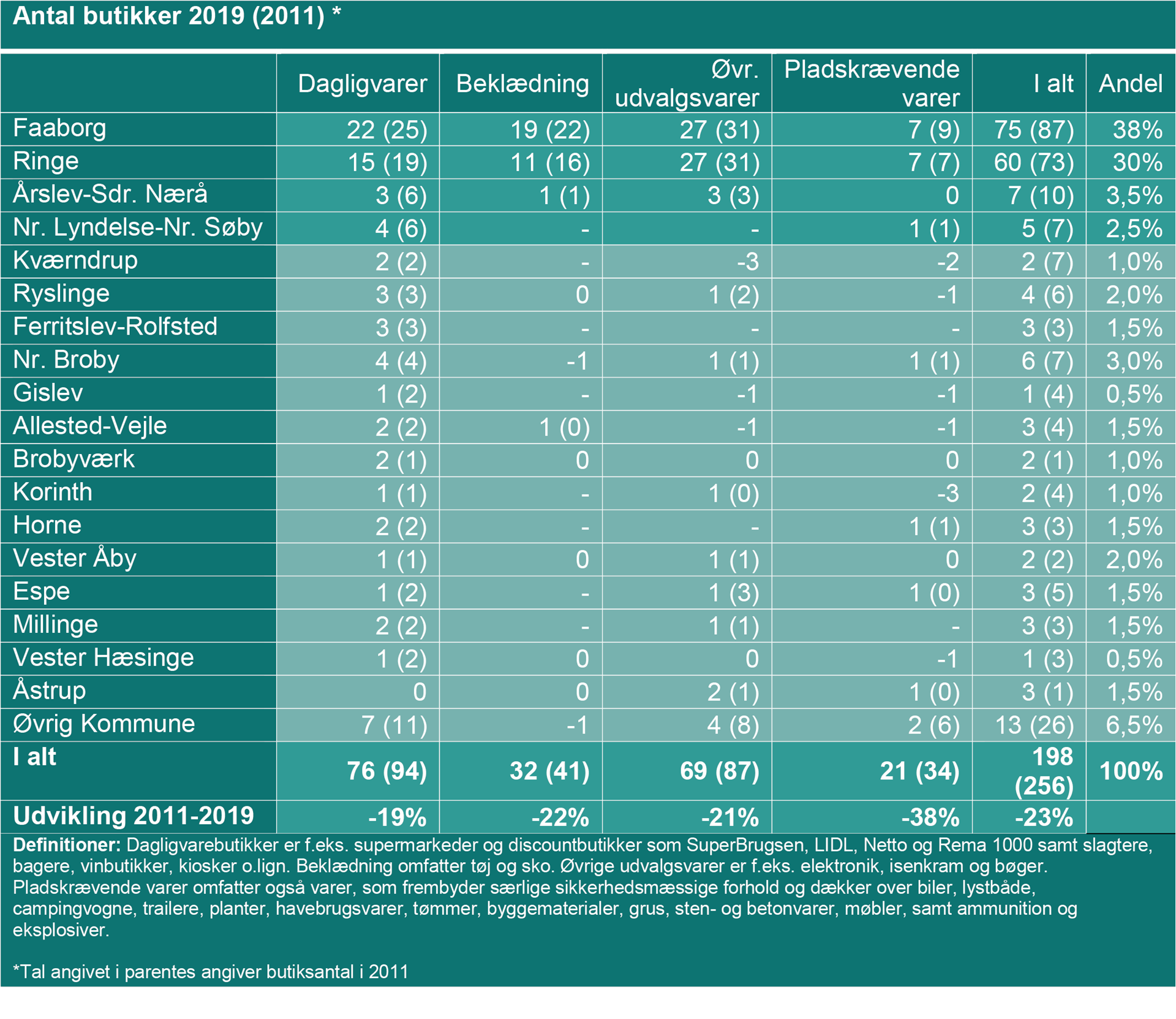 Faaborg-Midtfyn Kommune har mistet ca. 23 % af sine butikker i perioden 2011-2019. Tilbagegangen svarer til tendenserne på landsplan. I Faaborg-Midtfyn Kommune er det bemærkelsesværdigt,