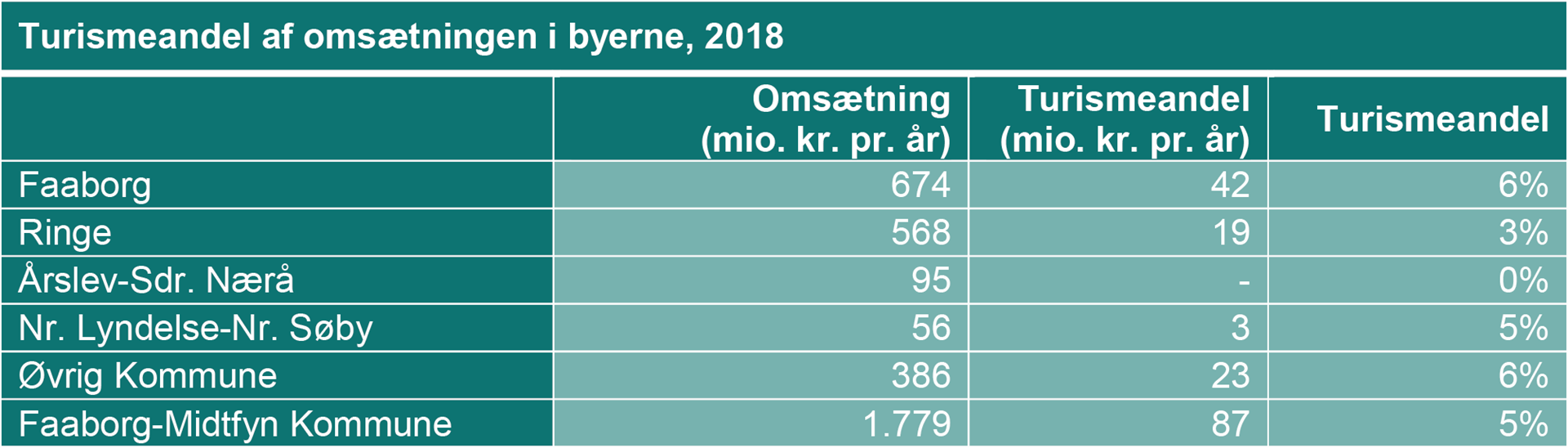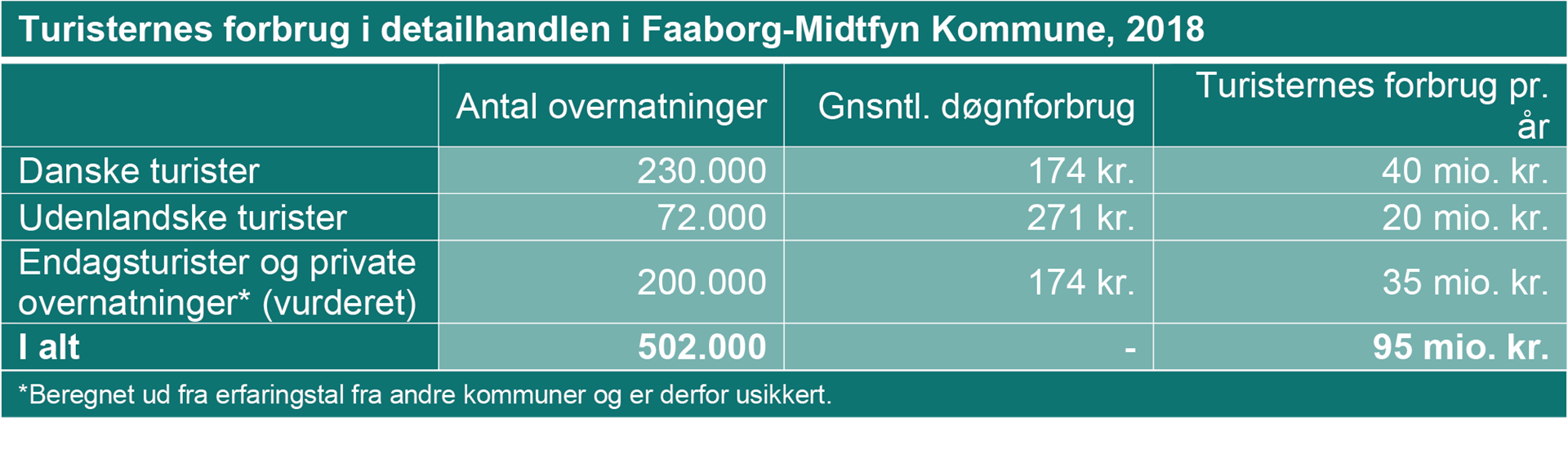 Turisternes forbrug i butikkerne i Faaborg-Midtfyn Kommune er beregnet til i størrelsesordenen 90 mio. kr. i 2018 svarende til 5 % af butikkernes samlede omsætning.