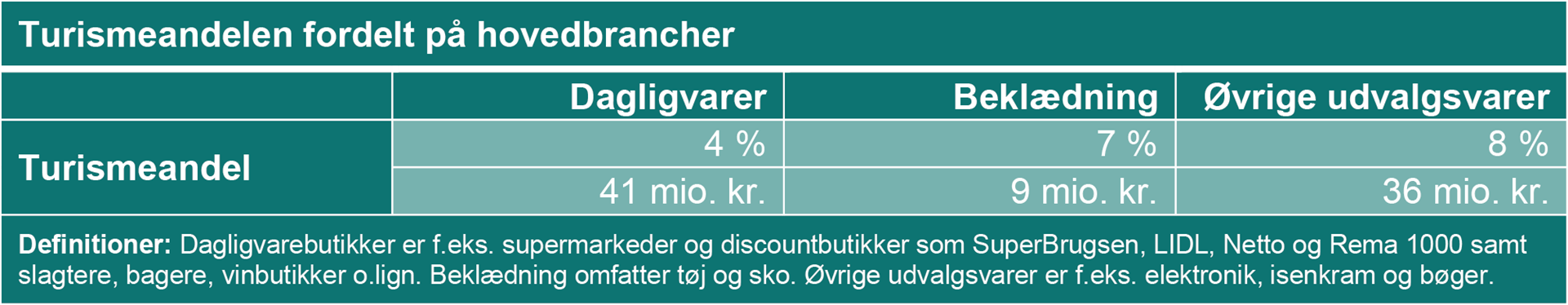 Turismens andele af omsætningerne inden for hovedbrancherne er forskellige. Turismens andel af dagligvareomsætningen er 4 %, inden for beklædning 7 % og inden for øvrige udvalgsvarer 8 %.