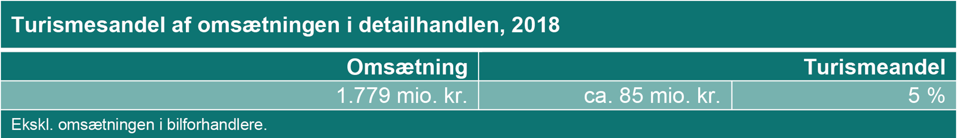 Detailhandlerne i ca. 115 butikker, svarende til knap 60 % svarede, at de har turister som kunder. Turisternes forbrug udgjorde ca. 5 % af den årlige omsætning svarende til en samlet omsætning fra turisterne på ca. 85 mio. kr. Detailhandlernes svar omfatter al turisme under ét, dvs. både overnattende og endagsturister og udtrykker deres bedste skøn. Det kan selvfølgelig være vanskeligt for detailhandlerne at skelne mellem danske turister og borgere fra egen kommune, men i størrelsesorden passer de ca. 85 mio. kr., som kan beregnes ud fra detailhandlernes svar, til de ca. 95 mio. kr., som kan beregnes ud fra overnatningsstatistikken.