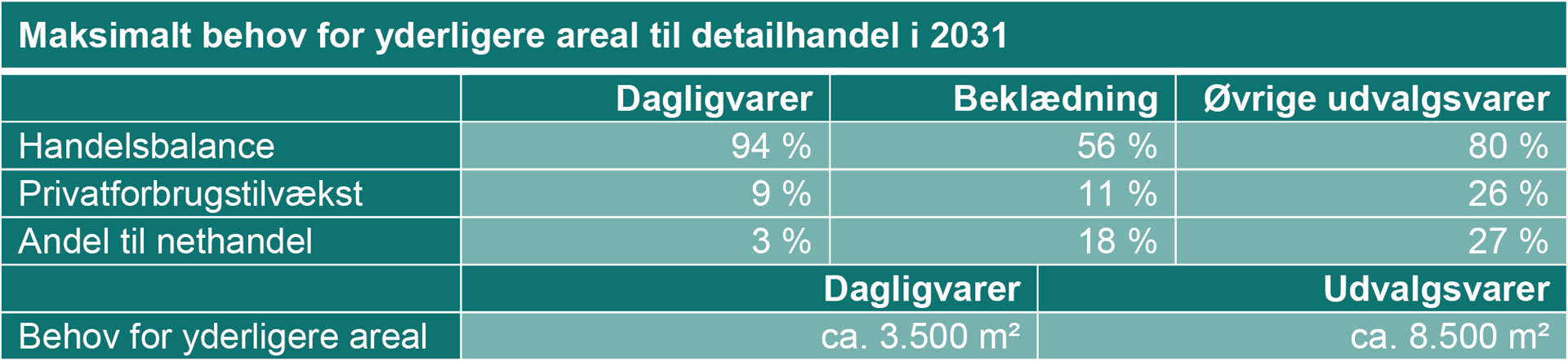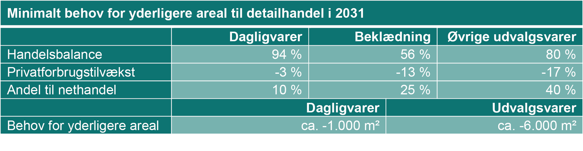 Afhængig af, om udviklingen vil læne sig op ad minimums- eller maksimumsscenariet, vil dagligvarehandlen i 2031 kunne ske på et areal der er mellem ca. 1.000 m² mindre end det nuværende eller ca. 3.500 m² større end det nuværende. Behovet for areal til udvalgsvarebutikker spænder fra et areal, der er ca. 6.000 m² mindre end det nuværende til et areal, der er ca. 8.500 m² større end i dag.