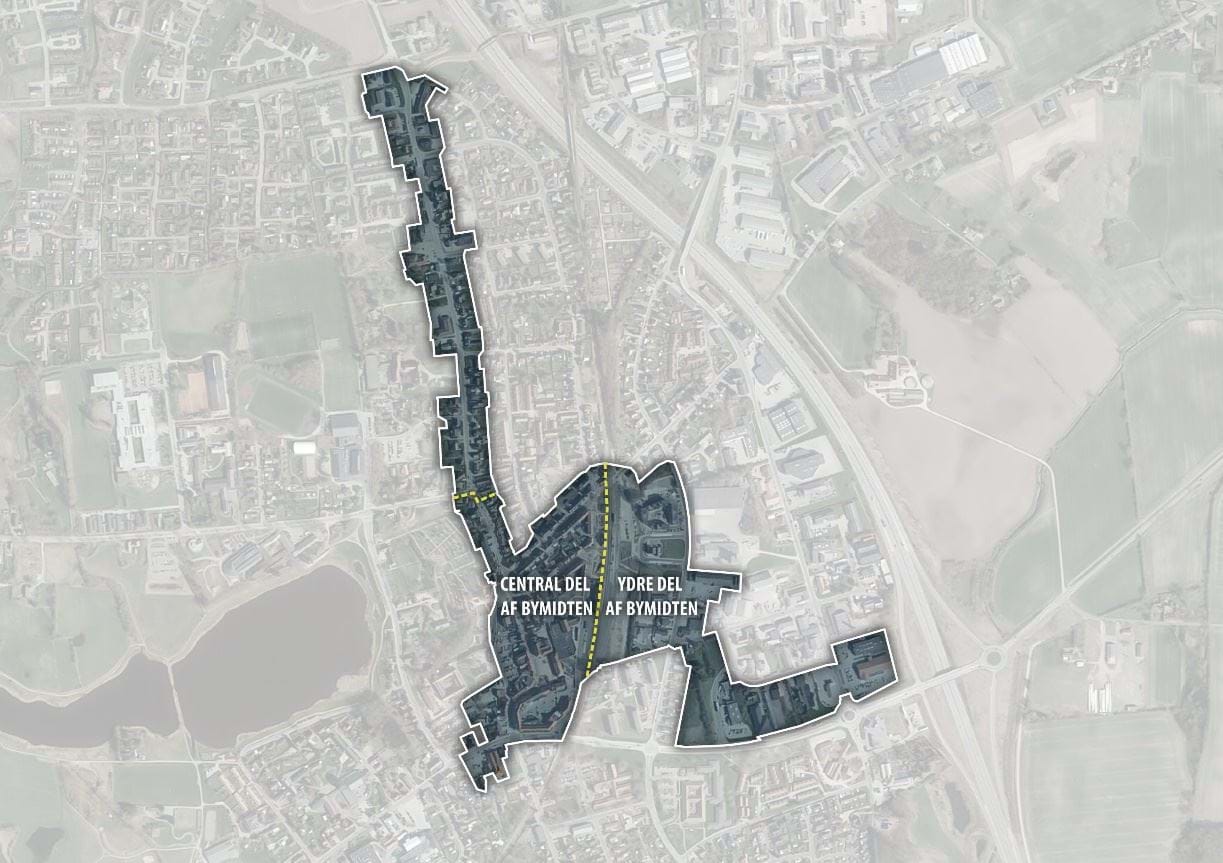 Det er Kommunalbestyrelsens mål, at udviklingen inden for bymidteafgrænsningen først og fremmest skal ske i den centrale del af bymidten, som omfatter Centrumpladsen, Algade, Jernbanegade, Østergade, Stationsvej, Vestergade og Ørbækvej vest for jernbanen. Bymidten udvides med et mindre område ved Netto, så hele Nettos areal bliver en del af bymidten.