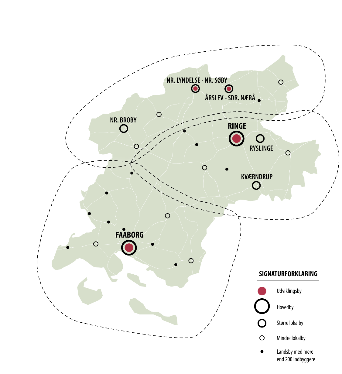 Det er målet, at udnytte den positive udvikling i indbyggertallet i udviklingsbyerne Årslev-Sdr. Nærå og Nr. Lyndelse-Nr. Søby til først og fremmest at styrke dagligvarehandlen, men også at skabe gode mulighed for, at udvalgsvarebutikker og andre byerhverv kan etablere sig i tilknytning til dagligvarebutikkerne. Det er derfor også målet, at dagligvarebutikkerne placeres i tilknytning til bymidterne.