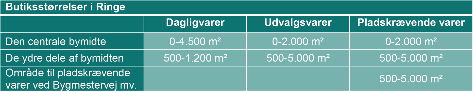 Nye udvalgsvarebutikker i den østlige del af den ydre bymidte skal være større end 500 m² for at sikre, at den centrale del af bymidten fortsat har en koncentration af mange mindre butikker samtidig med, at Ringe også kan tilbyde muligheder for de større udvalgsvarebutikker. Udvalgsvarebutikker i de ydre dele af bymidten må ikke være større end 5.000 m².