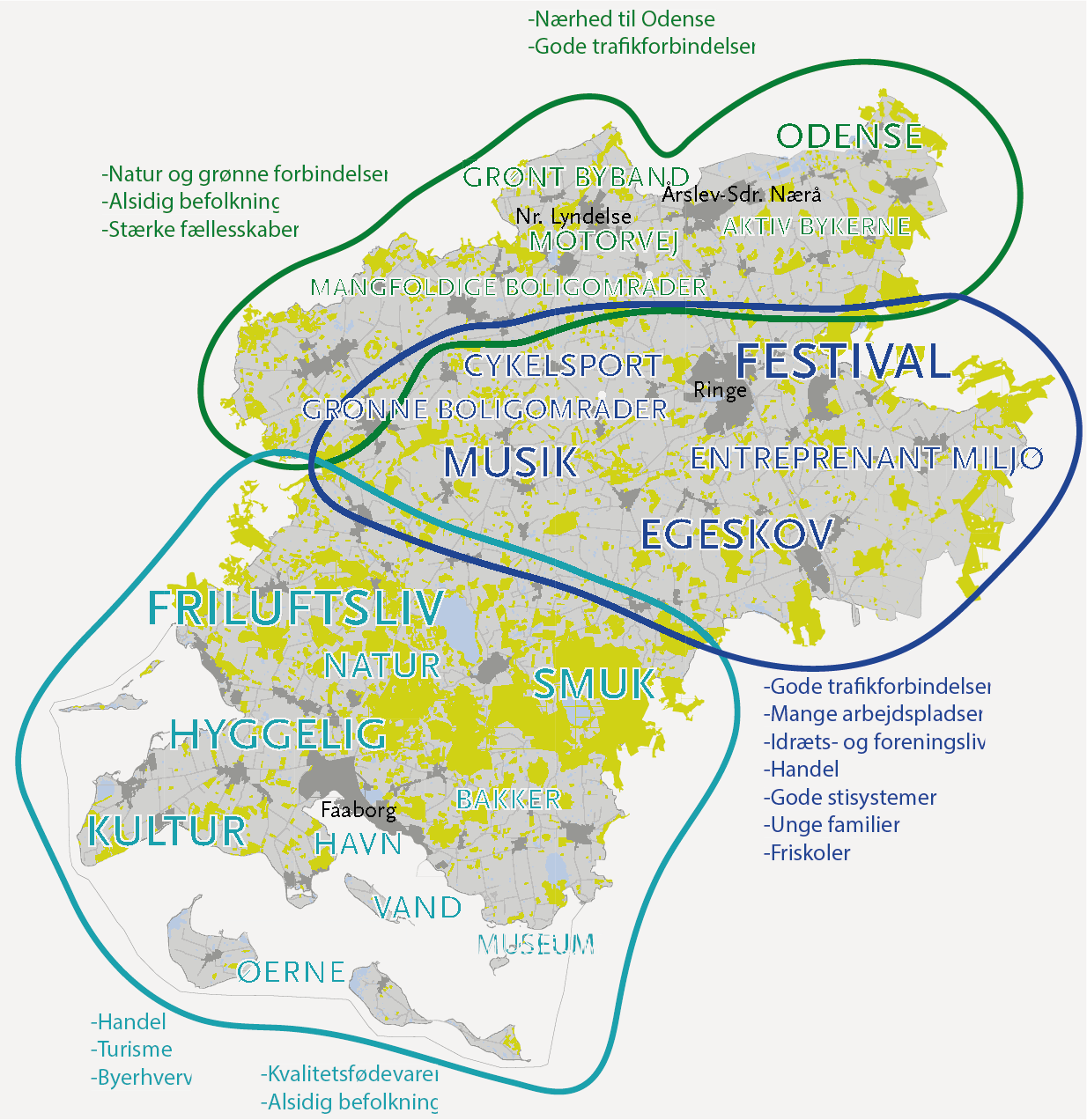 De tre egne med udviklingsbyerne Årslev-Sdr. Nærå og Nr. Lyndelse-Nr. Søby i forstadsbåndet mod nord, Ringe-egnen i midten med Ringe som naturlig hovedby og Faaborg-egnen mod syd med Faaborg som naturlig hovedby. Kilde: "Sammen skaber vi det bedste sted" – Udviklingsstrategi 2019-2030, Faaborg-Midtfyn Kommune, 2019.