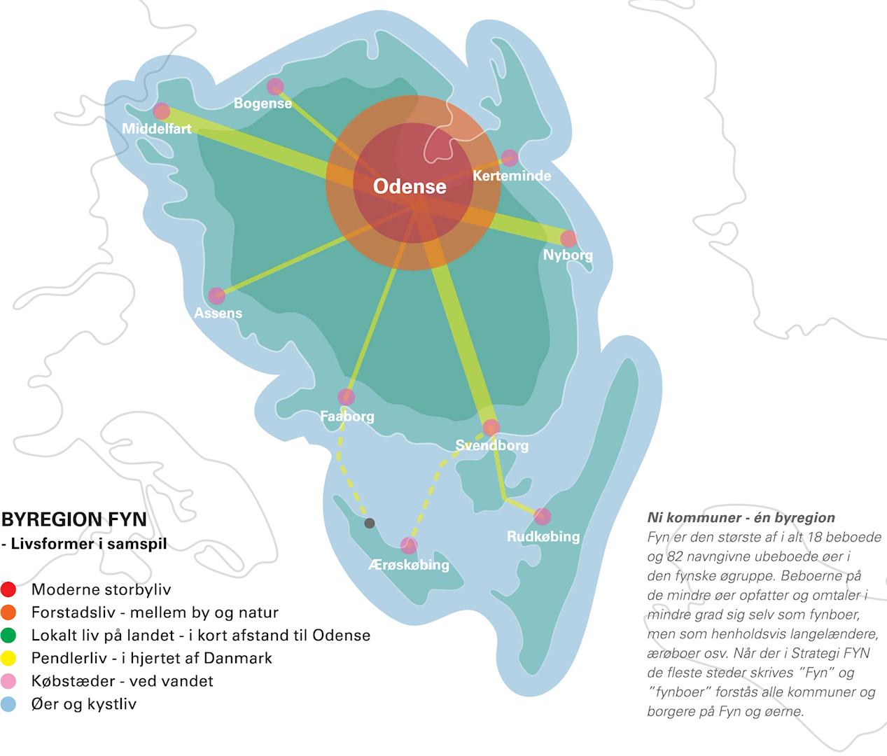Fyn er geografisk en klart afgrænset byregion, og der er en klar rollefordeling mellem Odense som hovedby og de omkringliggende byer, landområder og øer. Tilsammen udgør Fyn en stærk enhed, og det er i bevidstheden om, hvilken rolle vi ønsker at spille på Fyn, og viljen til det gode samarbejde, den stærke byregion skabes. Kilde: "Strategi FYN 2018-21", Byregion Fyn, 2018.