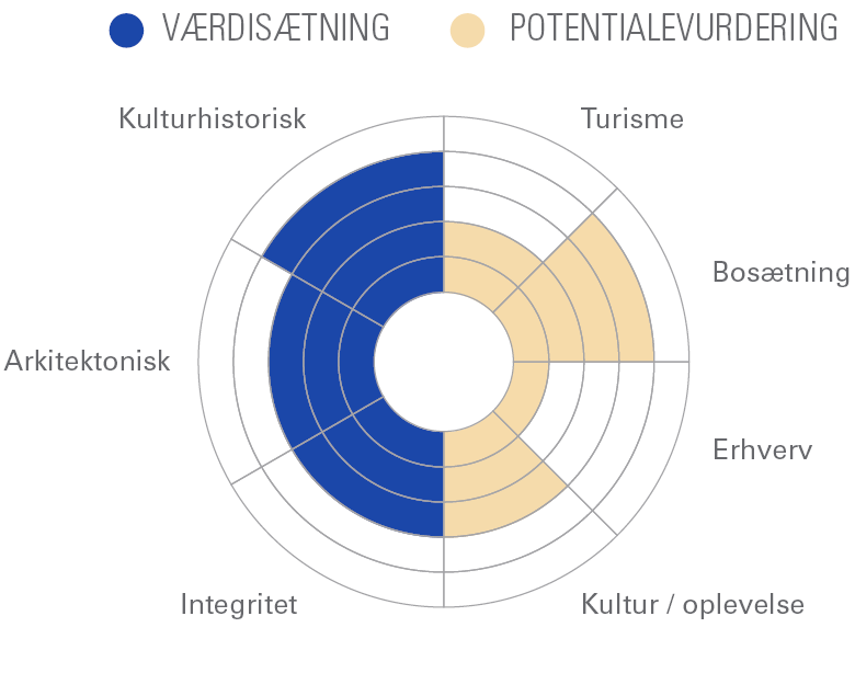 Bevaringsinteresserne i området er middel. Ved planlægning bør der tages hensyn til områdets helhed, struktur og enkeltelementer, så det visuelle indtryk af kulturmiljøet bevares. Ved ny bebyggelse bør denne tilpasses områdets eksisterende bebyggelse mht. skala og arkitektur. Området har potentialer i forhold til bosætning samt kulturhistorie og oplevelse.
