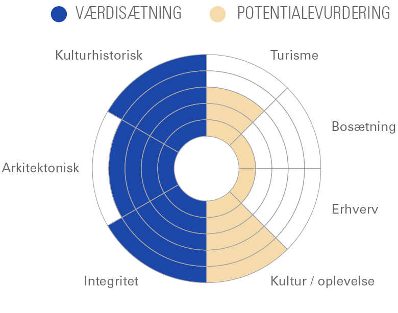 Bevaringsinteresserne i området er høje. Ved planlægning bør der tages hensyn til områdets helhed, struktur og enkeltelementer, så det visuelle indtryk af kulturmiljøet bevares. Det er derfor vigtigt, at områdets bygninger bevares, fastholdes i deres oprindelige udtryk, og ændringer foretages varsomt og med respekt for områdets historie. Ligesom områdets og bygningernes anvendelse bør fastholdes i sine nuværende eller lignende funktioner for at sikre mod forfald. Området har potentialer i forhold til turisme samt kulturhistorie og oplevelse.